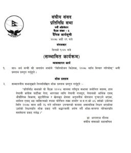 संसद सचिवालयले मंगलबार बस्ने प्रतिनिधिसभा बैठकको कार्यसूची सोमबार नै सार्वजनिक गरेको छ । आज दिउँसो बस्ने बैठकका लागि सम्भावित कार्यसूची सार्वजनिक गरेको हो । सचिवालयका अनुसार अर्थमन्त्री जनार्दन शर्माले ‘विनियोजन विधेयक, २०७८ माथि विचार गरियोस्’ भनि प्रस्ताव प्रस्तुत गर्ने कार्यसूची रहेको छ । यस्तै बैठकमा २०४८ सालमा राष्ट्रिय सभामा मनोनित सदस्य रुक्म शम्शेर जवराको निधनप्रति शोक प्रस्ताव प्रस्तुत गर्ने कार्यसूची रहेको संसद सचिवालयले जनाएको छ ।