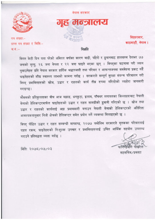 यस्तै पहिरोमा परी धनकुटामा ७, हुम्लामा ६, बैतडीमा ४ जनाको मृत्यु भएको छ ।