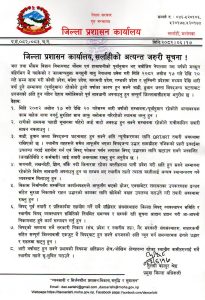 प्रशासनले शुक्रबार एक सूचना जारि गर्दै जिल्लावासीलाई अविरल वर्षाको कारणले जोखिम बढ्ने देखिएपछि उच्च सतर्कता अपनाउन आग्रह गरेको हो। प्रशासनले १७ देखि २० गतेसम्म भारि वर्षाको सम्भावना रहेकाले अत्यावश्यक नपरी यात्रा नगर्न आग्रह गरेको छ ।