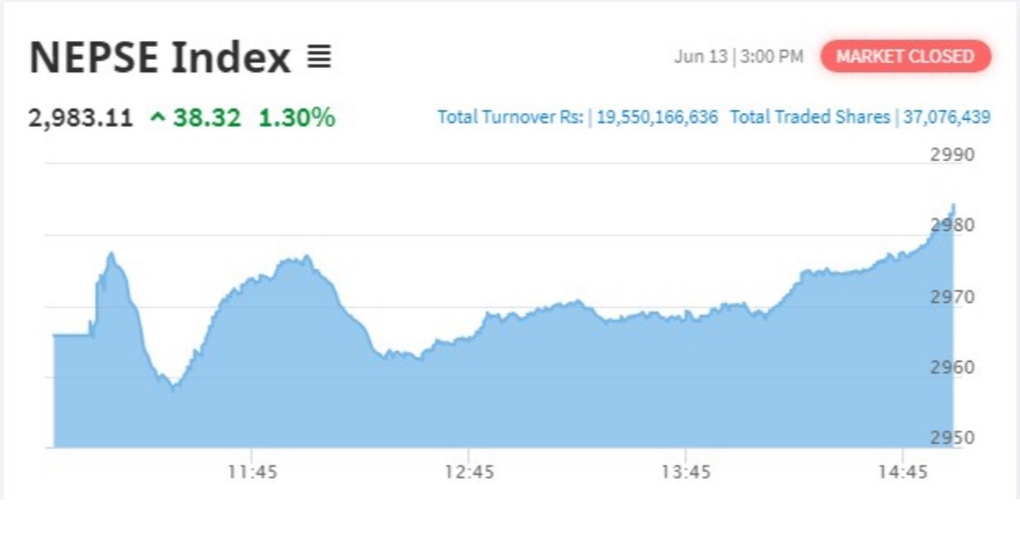आइतबार मूल्य परिसूचक पनि उच्च अंकले बृद्धि भई नेप्से परिसूचक २९८३.११ को बिन्दुमा पुगेको छ । आज नेप्से परिसूचक ३८.३२ अंकले बृद्धि भएको हो । कूल तीन करोड ७० लाख ७६ हजार ४३९ कित्ता शेयर खरिद बिक्री भएको छ ।