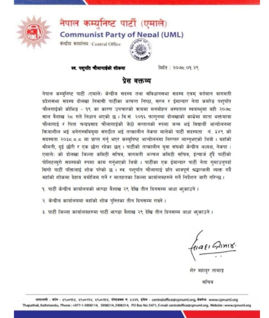 पार्टी सचिव शेरबहादुर तामाङद्वारा जारी शोक विज्ञप्तिमार्फत दोलखा निवासी चौलागाइको निधनप्रति दुःख व्यक्त गर्दै वैशाख २९ गतेदेखि तीनदिनसम्म पार्टी केन्द्रीय कार्यालयमा झण्डा आधा झुकाउने र तीन दिनसम्म शोक पुस्तिका राखिने जनाइएको छ ।