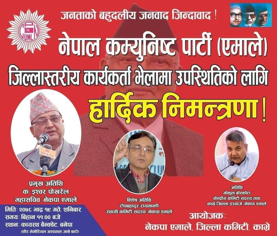 नेकपा एमाले, जिल्ला कमिटि काभ्रेको आयोजनामा भोलि बनेपामा जिल्लास्तरीय कार्यकता भेला कार्यक्रम हुने भएको छ । नेकपा एमाले विभाजन पश्चात पहिलो पटक हुन लागेको उक्त कार्यक्रमा प्रमुख अतिथ्यताका रुपमा नेकपा एमालेका महासचिव ईश्वर पोखरेल, बिशिस्ट अथितिका रुपमा नेकपा एमालेका स्थायी कमिटी सदस्य टोपबहादुर रायमाझीका साथ काभ्रे जिल्ला नेकपा एमाले पार्टी इन्चार्ज एवं पूर्व सञ्चार तथा सूचना प्रविधि मन्त्री गोकुल बाँस्कोटाको अतिथित्य रहने कार्यक्रम आयोजकले जानकारी दिएका छन् ।